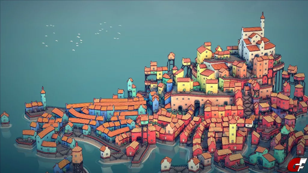 Es ist viel mehr ein Spielzeug, als ein Spiel. Such dir Farben aus, erschaffe bunte Häuserblöcke auf dem unregelmäsigem Rasterund sieh zu wie Townscaper's innerer Algorithmus aus diesen Blöcken süße kleine Häuslein, Torbögen, Treppen, Brücken und üppige Gärten macht. Alles abhängig von der jeweiligen Platzierung.
