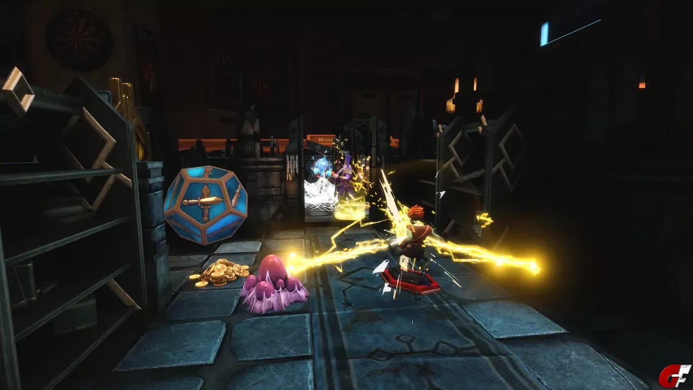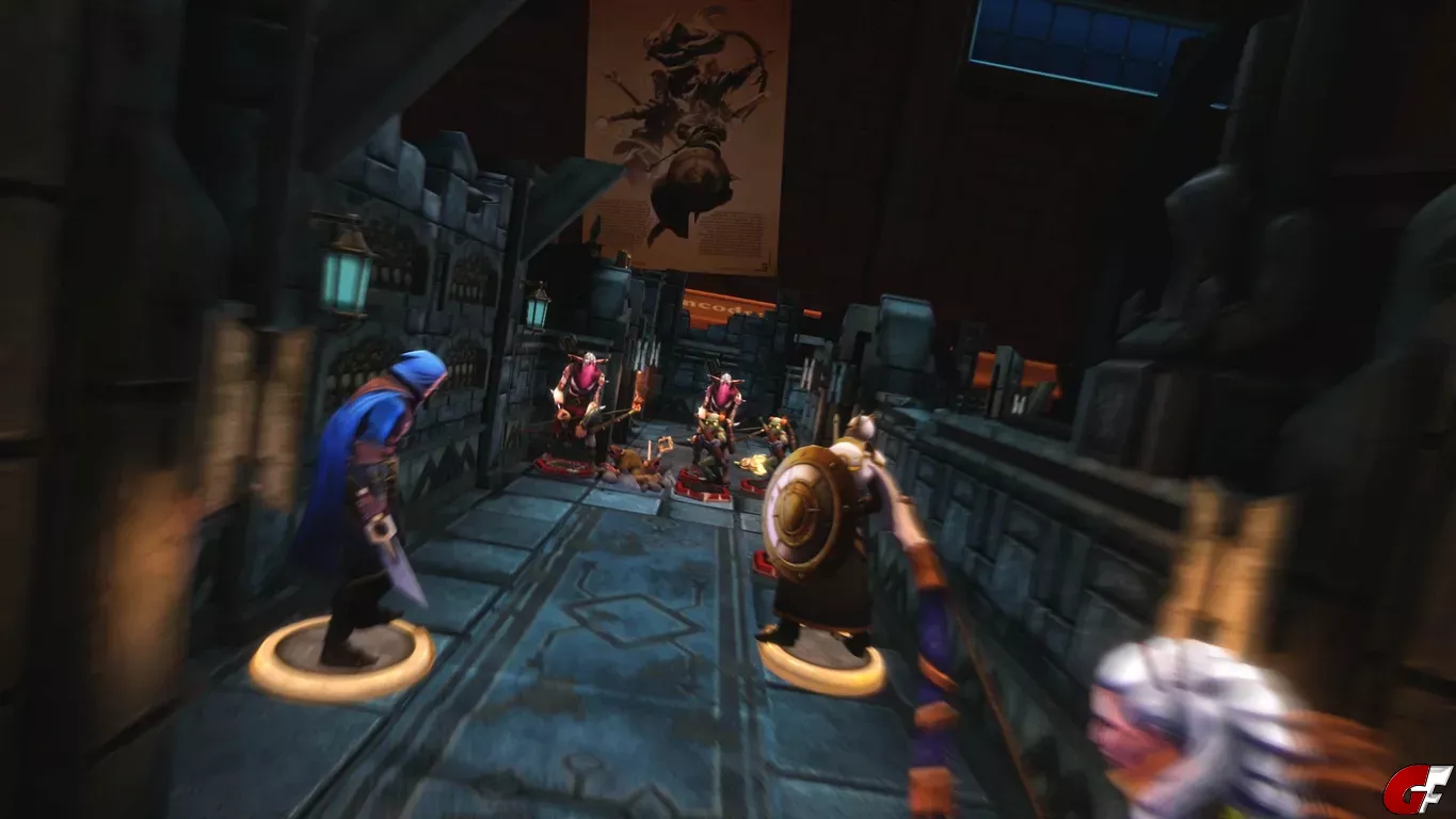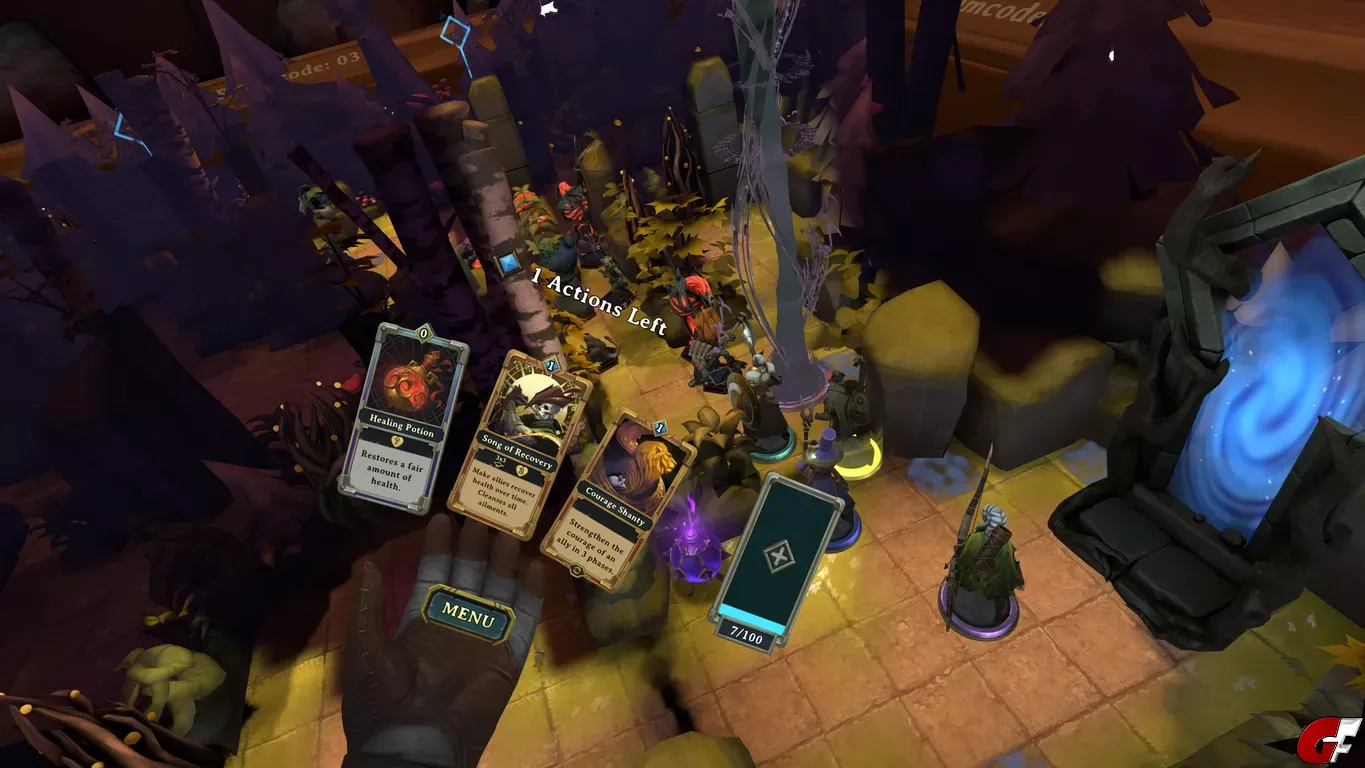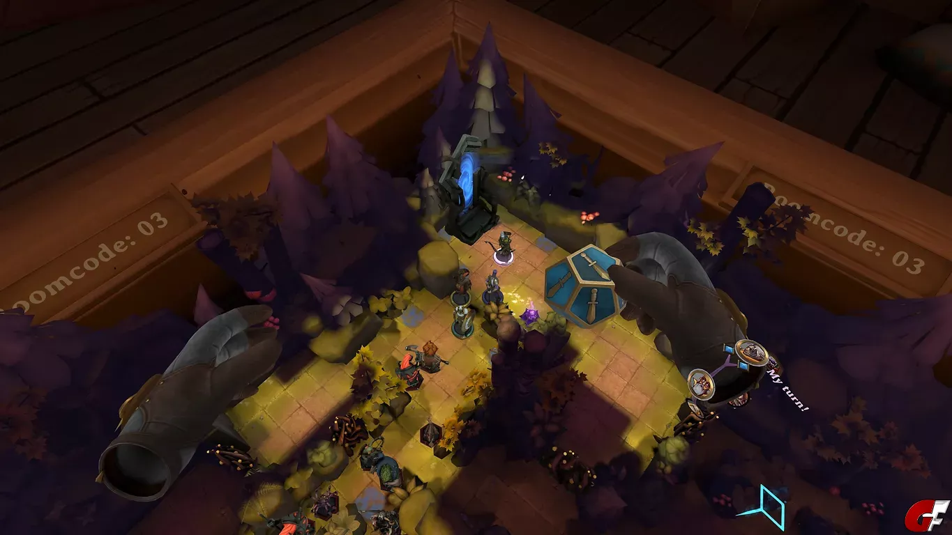 Demeo fühlt sich an wie ein echtes Tabletop, wir stehen im Spiel quasi an einem Tisch, auf dem dann unsere Figuren und die Karte aufgebaut sind. Der VR-Modus ist optional, fühlt sich aber echt cool an. Wir können unsere Figuren greifen, wenn wir die Hand drehen, dann halten wir die Karten aufgefächert dort und auf dem rechten Armband sehen wir, wer am Zug ist und wieviele Aktionen der Charakter hat. Das Gameplay ist relativ simpel, wir haben mit jedem der vier Charaktere bis zu zwei Aktionen. Wir können laufen, angreifen, Türen oder Truhen öffnen oder eben Fähigkeiten nutzen, das funktioniert über unser Kartendeck. Ziel ist es meist den Schlüssel bei einem starken Gegner zu finden, welcher den Ausgang öffnet, den wir noch finden müssen. Das Spiel fühlt sich gerade am Anfang allerdings sauschwer an, denn wir sehen nicht immer, wo Gegner lauern und hinter jeder aufgedeckten Ecke könnte ein großer Boss lauern. Das Spiel lässt sich mit bis zu vier Spielern im Multiplayer spielen oder eben ganz alleine.